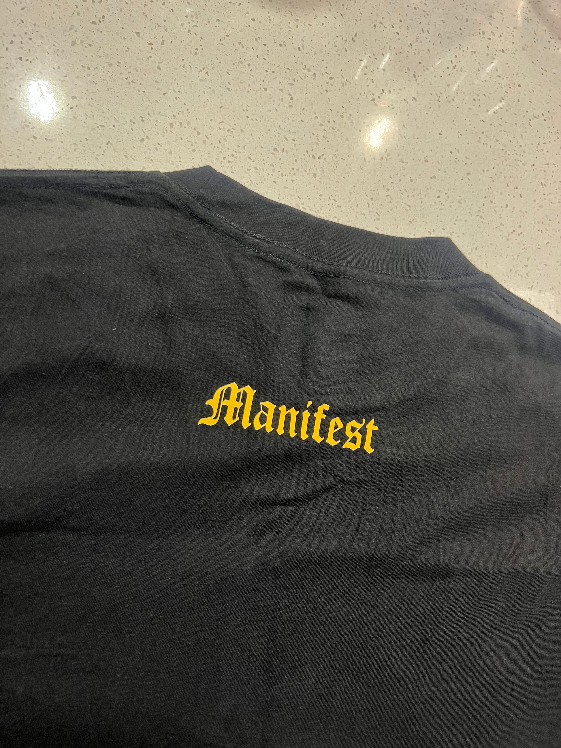Shirt with dove design on front, Manifest design on back, and TF Neck Tag.